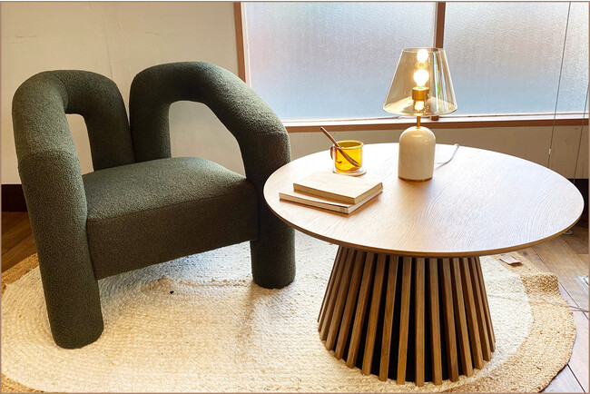 1人掛けを2台置いてラウンジのようにしてみたり、天然木のローテーブルと合わせてみても、北欧風のおしゃれなリビングになります。