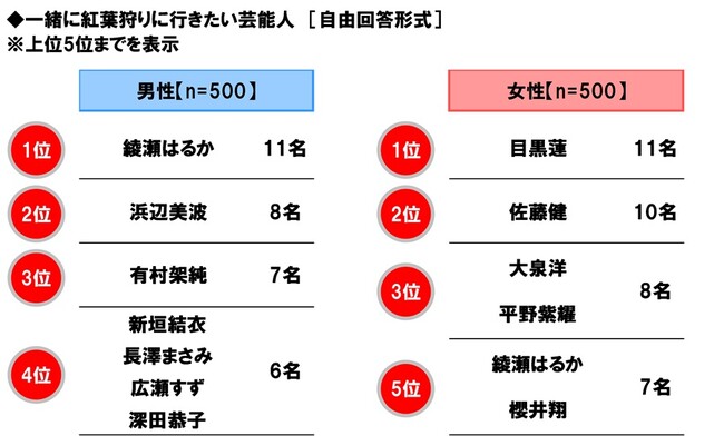 一緒に紅葉狩りに行きたい芸能人 男性回答1位「綾瀬はるかさん」、女性回答1位「目黒蓮さん」