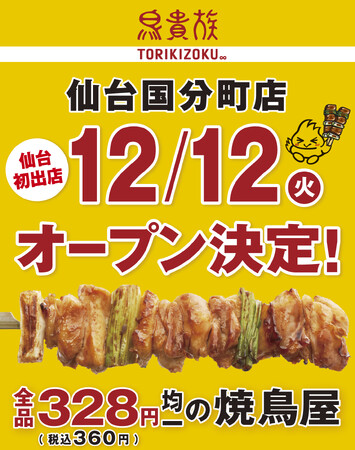 株式会社鳥貴族(本社:大阪市浪速区 代表取締役社長:江野澤暢男)が運営する全品328円均一(税込360円)の焼鳥屋「鳥貴族」は、東北地方で初出店となる、仙台国分町店のオープン日が12月12日(火)に決定しましたのでお知らせいたします。