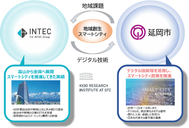 慶應義塾大学SFC研究所の研究者とTISインテックグループの株式会社インテックの研究者が共同して、地域における社会インフラサービスの課題をICTとプラットフォーム概念を用いて解決することを目指した研究活動を推進しています。2021年3月、慶應義塾大学SFC研究所と延岡市、延岡市教育委員会との間で、地域創生に関する研究協定が締結され、同時双方向遠隔授業(論理コミュニケーション)など共同研究が推進されています。