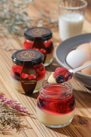 会津地鶏の卵と福島県内産の卵をブレンドし、会津の牛乳べこの乳を使用したとろ~りなめらかなぷりんとつるんとしたベリーのジュレを組み合わせました。「あかべこ×こっこぷりん」から「あかべこっこぷりん」と名付けました。