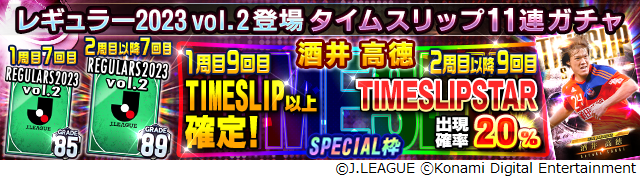 タイムスリップシリーズの酒井高徳選手が登場!1周目9回目のSPECIAL枠で「TIMESLIP以上確定」、2周目以降6回目で「お気に入りクラブG89以上レギュラー2023 vol.2ガチャ券」が獲得できます!