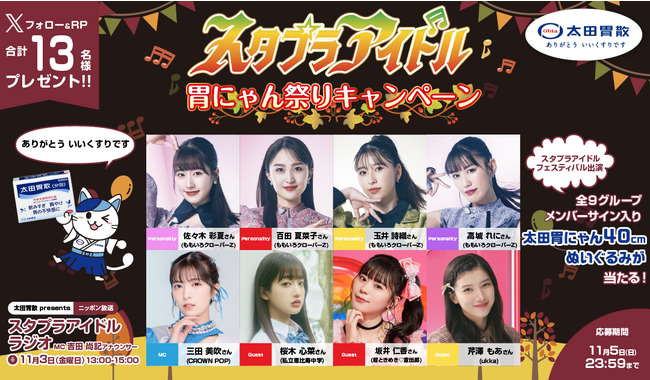 株式会社 太田胃散(本社:東京都文京区/代表取締役社長:太田淳之)は、「「スタプラアイドル」胃にゃん祭りキャンペーン」として、10月29日(日)に実施される「スタプラアイドルフェスティバル~秋の新曲収穫祭~」の出演グループ全10組のメンバーサイン入り「40cm太田胃にゃんぬいぐるみ」が当たるキャンペーンを実施します。同社のニッポン放送「太田胃散 presents スタプラアイドルラジオ」とのコラボ企画となっておりますので、ぜひ番組ともにチェックしてください。
