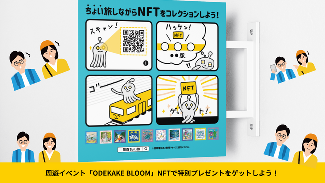 関西周遊イベント「ODEKAKE BLOOM」では、対象駅にて関西出身のイラストレーター10名が手掛けた、オリジナルNFTを獲得することができます。獲得したNFTは連携施設に提示することで、ご当地ならではの特別なプレゼントをゲットすることも。