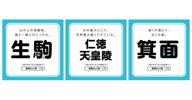 郊外観光地では、六甲エリア、箕面エリア、生駒エリア、堺エリア。大阪環状線内では、福島駅、大阪城公園駅、天王寺駅、大正駅にて掲示中です。