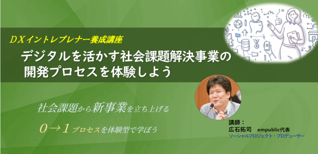 近年、「社会課題解決をDXによって事業化しよう」という新しいビジネス領域が広がり、多くの企業が関心を寄せています。しかし、社会課題解決に役立つDX事業の重要さはわかるが、「どこから手を付ければいいのか」「事業にするには何が必要か」という声も多く聞かれます。そこで、株式会社エンパブリック(東京都文京区、代表取締役:広石拓司)は、社会起業支援の豊富な経験を活かし、「課題分析から事業立案までの“0→1プロセス"」を体験し、DX新規事業立ち上げに必要な考え方とスキルを短期集中で学べる講座を開催します。これまで企業研修で約180名が受講し、事業開発の初心者にも実務者にも役立つ講座として大変好評を得ているプログラムを一般参加者向けにオンライン形式で開催します。