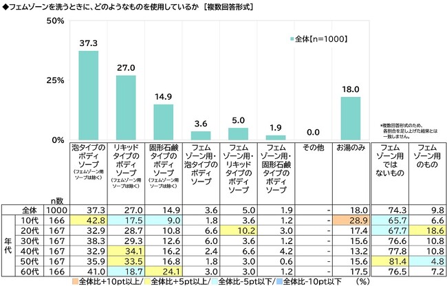 全回答者(1,000名)に、フェムゾーンを洗うときに、どのようなものを使用しているか聞いたところ、「泡タイプのボディソープ(フェムゾーン用ソープは除く)」が37.3%、「リキッドタイプのボディソープ(フェムゾーン用ソープは除く)」が27.0%、「固形石鹸タイプのボディソープ(フェムゾーン用ソープは除く)」が14.9%、「フェムゾーン用・泡タイプのボディソープ」が3.6%、「フェムゾーン用・リキッドタイプのボディソープ」が5.0%、「フェムゾーン用・固形石鹸タイプのボディソープ」が1.9%となり、『フェムゾーン用ではないもの』は74.3%、『フェムゾーン用のもの』は9.8%でした。大多数の人は、フェムゾーン用のものではなく、普段身体を洗うときに使用しているボディソープをそのままフェムゾーンを洗うときにも使用しているようです。また、「お湯のみ」は18.0%となりました。一般的なボディソープはアルカリ性寄りのことが多く、そのようなボディソープで洗うと、フェムゾーンの自浄作用が落ちてしまいます。それを防ぐためには、pHの値がフェムゾーン用に調整されたボディソープを使用することがおすすめです。