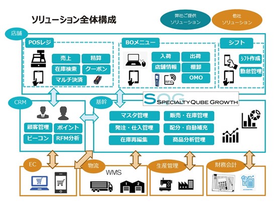 「SpecialtyQube Growth」は、POS・販売在庫管理・顧客管理・MD/分析業務など小売専門店の業務を網羅し、効率化を図るトータルソリューションです。また、ECやCRMといったさまざまなサービスとも柔軟に連携し、マルチ決済やOMO、ユニファイドコマースなどお客様の新しい販売サービスの実現を支援しています。