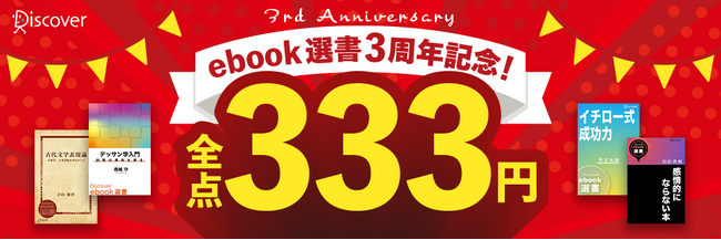 株式会社ディスカヴァー・トゥエンティワン(本社:東京都千代田区、取締役社長:谷口奈緒美)が未電子化コンテンツを電子化するレーベル「ebook選書」が、2023年11月1日に3周年を迎えました。これを記念して、同年11月1日から11月28日の間、対象のオンラインストアにて全点333円になるセールを開催します。