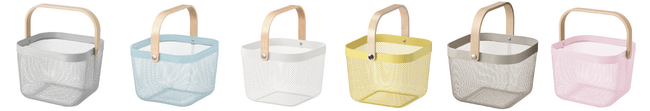 バーチ材突き板の持ち手とスチール製のバスケットの組み合わせが北欧らしいデザインで人気のRISATORP/リーサトルプ バスケットもお求めやすい価格になりました。事務用品はもちろん、キッチンや玄関、バスルームの小物の収納にも最適。いろんな場所へ持ち運ぶアイテムを入れるにも便利です。6色展開なので用途で色分けするのもおすすめです。