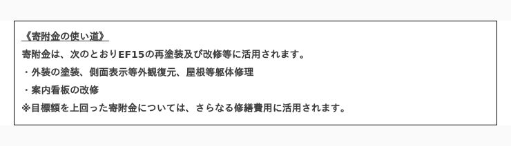 当時の車体は「ぶどう色2号」が塗られていましたが37年の年月を経て、塗装の剥離や劣化が進んでいます。そこで、機関車のファンや地域の子どもたちに喜んでもらうためにEF15の再塗装と整備を進め、もう一度、韮崎の地で「在りし日の姿の電気機関車」を取り戻そうと考えております。