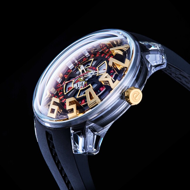 名前の由来はケースサイドの”ピラミッド”。クリア素材の角錐を敷き詰めた迫力ある意匠が、光を受けて様々な表情を生み出します。テンデンスのDNAともいえる3Dインデックはトノー型にアップデート。シースルーのシリコンストラップとケースは滑らかに接続され、腕に心地よくフィットします。
