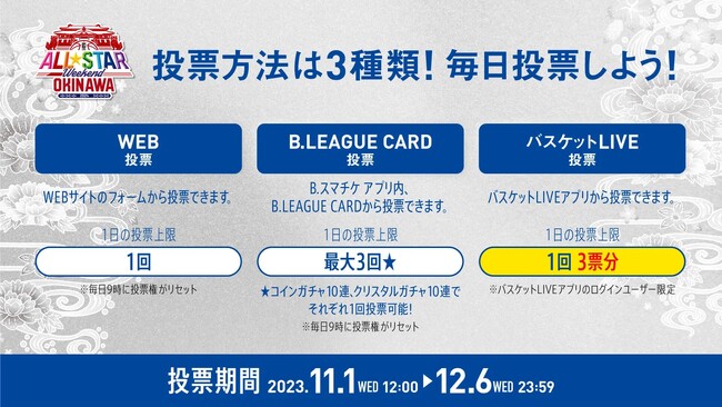 バスケットLIVEアプリのログインユーザー限定投票。1投票で“3票分”のカウントとなります。