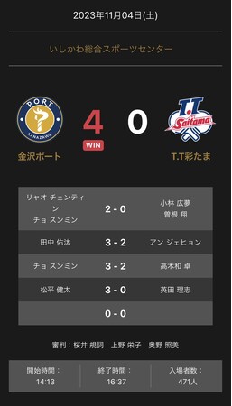 ノジマTリーグ2023-2024シーズン公式戦 11月4日(土)14:00試合開始 金沢ポート vs T.T彩たま 試合結果