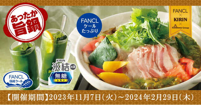 株式会社ファンケルは、海鮮居酒屋「はなの舞」「さかなや道場」などを全国展開するチムニー株式会社(本社:東京都墨田区 代表取締役社長:茨田篤司、以下チムニー)、キリンビール株式会社(本社:東京都中野区 代表取締役社長:堀口英樹、以下キリンビール)とコラボレーションし、当社のケール青汁を使った新商品「野菜の王様!ケールたっぷりカレー鍋」「ケールたっぷり!氷結無糖レモンサワー」をチムニーのグループ285店舗にて2023年11月 7日(火)より販売します。