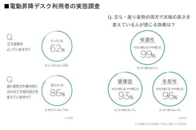 電動昇降デスクの利用者に昇降機能の利用について聞いたところ、約6割が立ち姿勢でも利用し、8割以上が座ったまま作業内容に合わせて天板の高さを変えています。また、立ち・座り姿勢の両方で天板の高さを変えている人の約9割が、快適性、健康面、生産性のいずれにおいても効果を感じています。