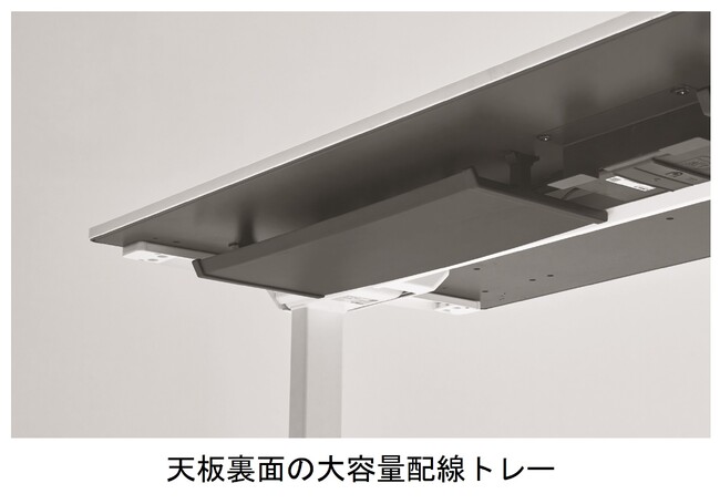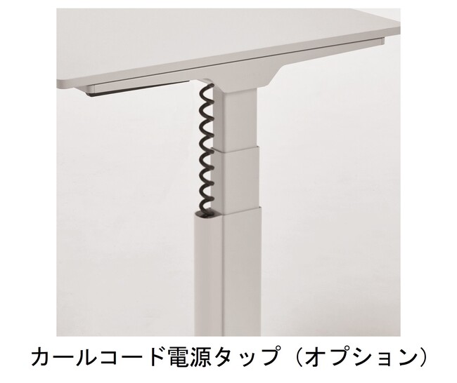 天板裏面に大容量配線トレーを配置し、ケーブルの余長をすっきり収めることができます。天板昇降時に脚回りに出てくるケーブルは、天板の昇降の動きに合わせてカールコードが伸び縮みし、縦ダクトにすっきり収まりきれいな見た目になるカールコード電源タップ(オプション)をラインアップしています。