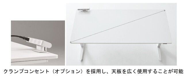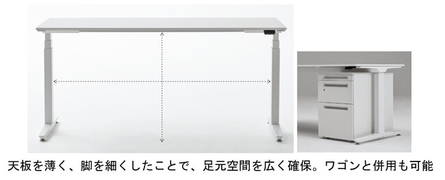 天板から立ち上げるクランプコンセントを採用することにより、天板面を広く使用することが可能です。複数のモニターを天板奥に配置することもできます。また、薄い天板と細い脚によって、広い足元空間を確保しました。ワゴンと併用することも可能です。