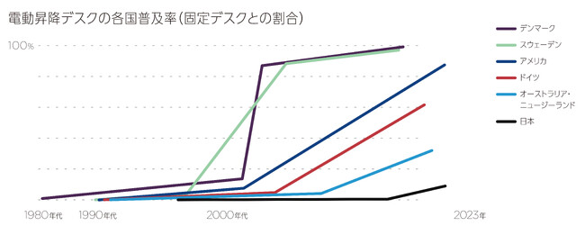 北欧では電動昇降デスクの普及率が9割近く、米国は8割程度である一方、日本での普及率は低いのが現状です※1。