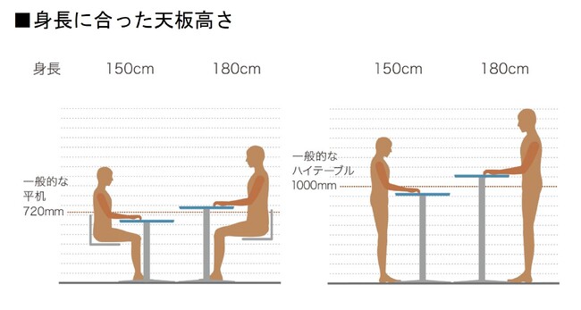 一般的に事務用デスクは高さ720mm、ハイテーブルは高さ1000mmですが、利用者の身長や体格によってちょうどいい天板の高さは異なります。高さが合わないデスクやテーブルを長時間使用し続けると、肩や首回りなどに疲労がたまりやすく、身体の不調や効率の低下につながります。一人ひとりの身長や体格に合わせて天板の高さを調節し、身体と家具のギャップを少なくします。
