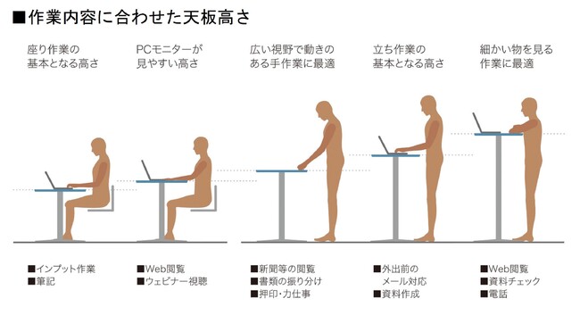 オフィスで行う筆記やインプット作業、ミーティング、電話、資料チェックなどの作業内容に合わせて天板の高さを調節できるため、作業しやすく、身体に負担がかからない姿勢を保つことができます。