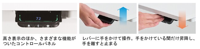 天板の高さを調節するコントロールパネルには、高さ表示のほかさまざまな機能がついています。姿勢を変える時間をお知らせする設定が可能なリマインダーボタンや、専用のスマートフォンアプリを活用して天板の昇降が可能になるBluetooth(R)ボタン、お気に入りの天板の高さを最大4つ登録できる高さ登録ボタンです。