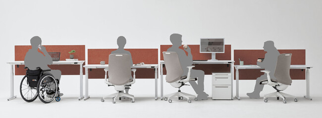 ワーカーがオフィスで快適に働くために、身長や体格の違いに合わせた家具や仕事の内容に合わせた設えが必要です。天板が上下に電動で昇降する電動昇降デスクは、立ち姿勢や座り姿勢が取れるほか、座り姿勢時に一人ひとりに合わせて細かく天板の高さを変えることができるため、より快適で働きやすい姿勢をとることが可能です。