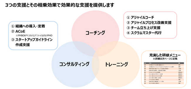 当社ではアジャイルを定着させるために、コーチング、コンサルティング、トレーニングの3つのサービスを柱にしており、この3つのサービスをシームレスに提供することにより、相乗効果を生み出し、効果的な支援を展開しております。