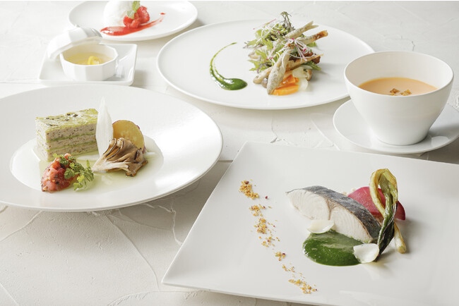 TOKYOウェルネスクリニック神谷町の医師の監修を受け、日本人が古来から慣れ親しんでいる発酵食品をテーマに、滋賀県の冬の食材を活かした琵琶湖マリオットホテルならではのランチ。オードブルは、琵琶湖の固有種であるホンモロコを滋賀県で丁寧に作られた無添加のお酢「淡海昔玄米」で南蛮漬けにし、「極上白味噌」のソースとともに味わうほんのりカレー風味がする品です。魚料理と肉料理から選べるメインは、やさしい味わいの3種をラインナップ。豚肩ロース肉と白菜のたたみ漬けは、豚肉と相性の良い白菜を重ね合わせ、昆布の風味豊かなソースで、梅肉をアクセントにお召し上がりいただけます。ドクター監修のもとシェフが考案したランチで、ヘルシーで優雅な食体験をお楽しみください。
