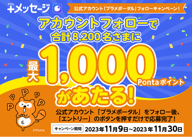 期間中、「+メッセージ」で「プラメポータル」の公式アカウントをフォローの上、キャンペーンページからエントリーいただいたお客さまのうち、抽選で合計8,200名さまに以下のPontaポイントをプレゼントします。