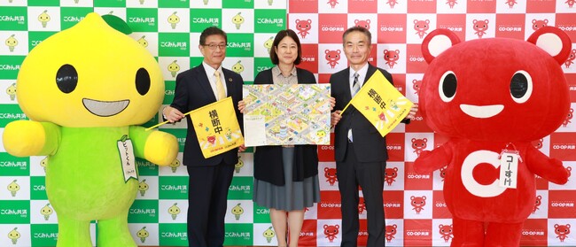 コープ共済連会員生協(125生協)では、当会の「お車の補償」である「マイカー共済」を取り扱っており、組合員の安心なカーライフのためのお役立ちを行っております。また、コープ共済連会員生協組合員の「マイカー共済」見積もり1件につき、双方公式キャラクターがコラボした「ピットくん・コーすけコラボ横断旗」を寄贈しています。