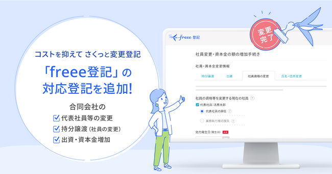 freee株式会社(本社:東京都品川区、CEO:佐々木大輔)は変更登記書類をオンラインで作成できる「freee登記」において、新たに合同会社の「代表社員等の変更」「持分譲渡(社員の変更)」「出資・資本金増加」の変更登記書類が作成可能になりました。