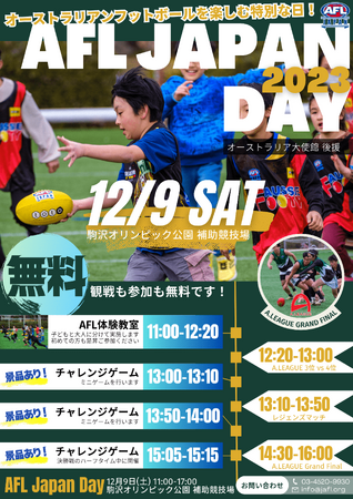 一般社団法人日本オーストラリアンフットボール協会(以下、AFL JAPAN)は11月9日(木)、AFL JAPAN DAYを駒沢オリンピック公園で開催することを発表しました。AFL JAPAN DAYはオーストラリアンフットボールを丸一日楽しむことができるイベントで、A.LEAGUEの決勝戦も同日に行われます。
