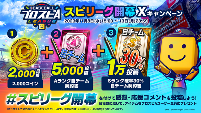 「スピリーグ」開幕を記念した、Xキャンペーンを開催します。公式Xで「#スピリーグ開幕」を付けて選手への応援コメント、試合の感想を投稿しよう!投稿数に応じて、ゲーム内アイテムを『プロ野球スピリッツA』ユーザー全員にプレゼントします。