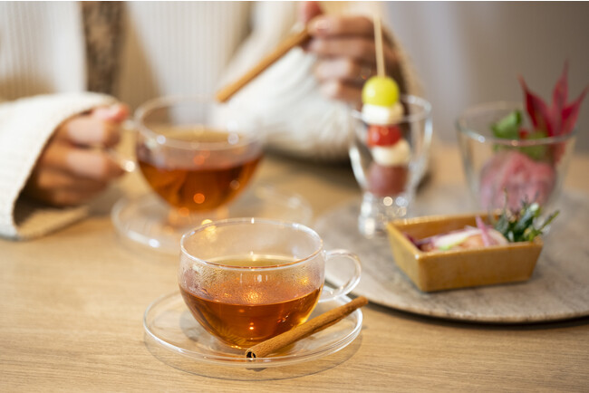 信州産りんごのドライフルーツを使用したハーブティー。温泉療法の特徴である「血行を良くする」「末梢神経を拡張させる」という効能に相乗効果をもたらすことが期待できます。お好みでカスタマイズできるクローブやシナモンの香りで、心安らぐひとときをお過ごしください。