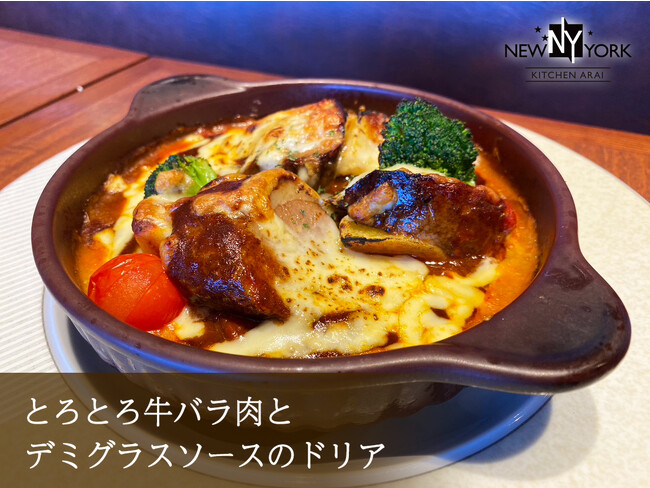 New York Kitchen ARAIリーフウォーク稲沢店(運営:株式会社RAVIPA 本社:東京都豊島区)では、新メニュー「とろとろ牛バラ肉とデミグラスソースのドリア」を販売いたします!とろとろの柔らかい牛バラ肉と熱々のチーズドリアをぜひご堪能ください♪お腹も心も満たされるHOTな新メニューです!