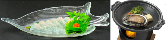 季節で内容が変わる会席料理に、平戸名物「ヒラメの薄造り」と、「アワビの踊り焼」をお付けした、