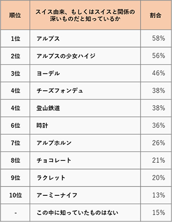 スイスと聞いて多くの人は何を思い浮かべるのでしょう。スイスに関係するものを挙げ、「スイス由来、もしくはスイスと関係の深いものだと知っているか」について聞いてみました。
