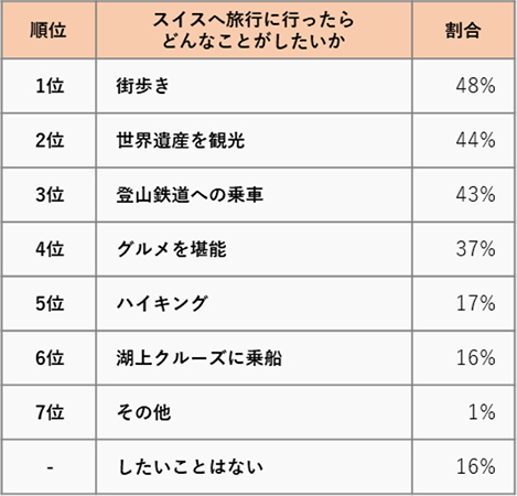 そんなスイスを海外旅行先に選んだとしたら、どんなことがしたいでしょう。阪急交通社がアンケートを実施しました。