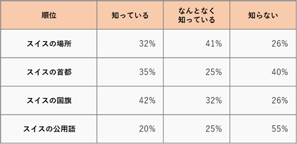 「スイスの場所」については、「知っている」と「なんとなく知っている」の合計が、73%となり、多くの人がだいたいの把握はできていることがわかります。