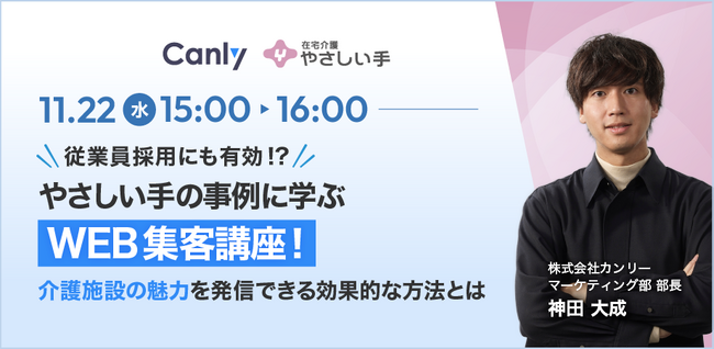 Googleビジネスプロフィール・HP・各SNSの一括管理サービス「カンリー」の開発・提供を行う株式会社カンリー(所在地:東京都品川区、代表取締役:辰巳 衛,秋山 祐太朗)は、2023年11月22日(水)に無料セミナー「やさしい手の事例に学ぶWEB集客講座!~介護施設の魅力を発信できる効果的な方法とは~」をオンライン開催いたします。