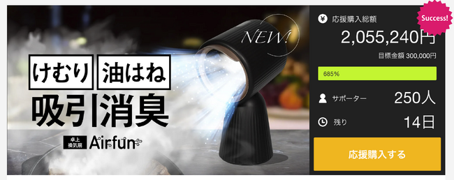 本製品は先行予約開始後5日で、250名以上の方に応援していただき、目標金額685%を突破しています。