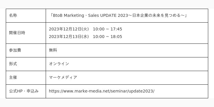 株式会社Bizibl Technologies(本社:東京都千代田区、代表取締役:花谷燿平、以下当社)は、株式会社マーケメディアが2023年12月12日(火)、13日(水)に開催する「BtoB Marketing・Sales UPDATE 2023~日本企業の未来を見つめる~」に登壇することをお知らせいたします。