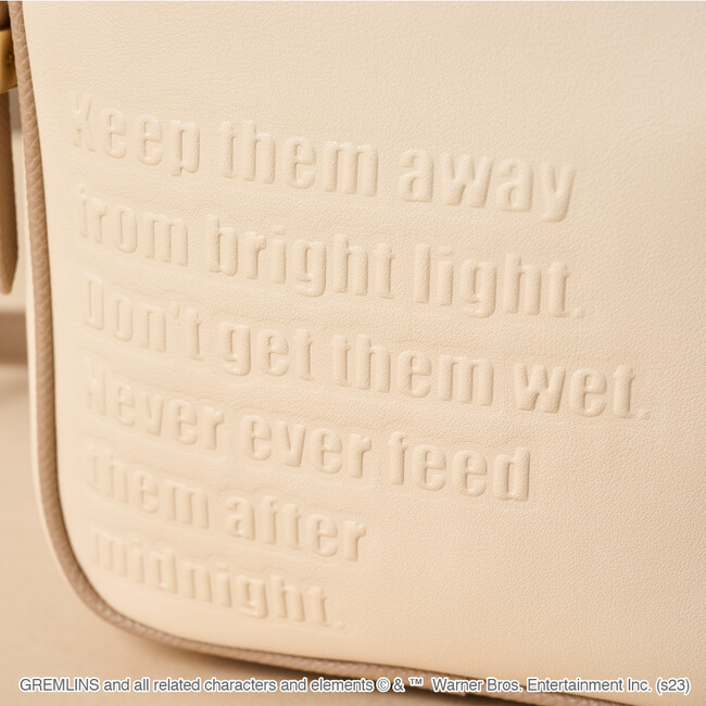 正面には、「ギズモ」が寝そべっている様子のアートと守らなければいけない3つの約束事項を型押しでデザイン。優しいベージュの同系色で落ち着いた配色に、「ギズモ」の愛らしいアートがマッチしたコーディネートにも合わせやすいカラーリングのショルダーバッグ。