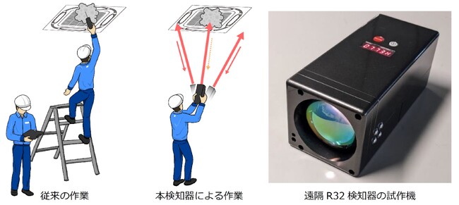 現在、エアコンのフィールドサービスで行われる冷媒漏えい有無の確認には、漏えいが疑われる箇所に検査機器を近づけて周辺の気体を採取する採気式(※2)を用いるのが一般的です。この手法では、エアコンの本体や配管は、天井の裏側など、脚立が必要な高所や人の手が届きづらい狭い場所に据え付けられていることが多いため、作業に手間と時間を要するだけでなく、安全性を確保しづらい場合や、検査機器を近づけることが困難な場合もありました。一方、このたび開発した本検知器は、離れた場所から対象物周辺に向けてレーザー光を照射することで、レーザー光の経路中におけるR32の有無を遠隔から効率的に確認できます。従来の採気式と比べ、作業工数の大幅な削減や安全性の向上が期待でき、その後の迅速な対処にもつなげられます。