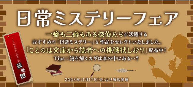 マイクロマガジン社(東京都中央区)は、ことのは文庫の「日常ミステリー」系人気作をピックアップした『日常ミステリーフェア』を2023年11月17日(金)より順次開催いたします。