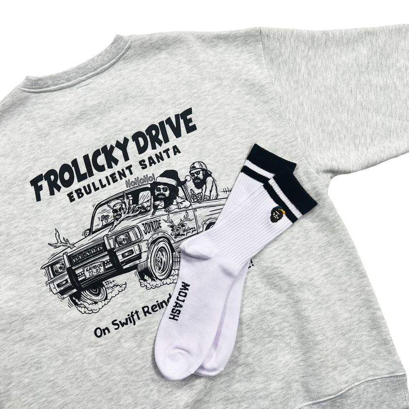 2023年のホリデーコレクションは、モジャッシュがサンタクロースに変身!サンタに扮したモジャッシュが、アメリカンなバイクやトラックをかっこよく乗り回してプレゼントを配りにいったり、歌ったり、キックボードを楽しむ姿を見せています。現代版のサンタクロースは、こんな魅力的な姿なのかもしれません!想像するだけで、クスッと笑いがこぼれることでしょう。コレクションのカラーバリエーションには、ホリデーシーズンを彷彿とさせる赤やグリーンに加え、コーディネートしやすいブラックやアッシュグレーもラインナップ。さらにモジャッシュが刺繍されたラインソックスをプレゼント!着用してホリデー気分を盛り上げるだけでなく、贈り物としても大変喜ばれるアイテムです。