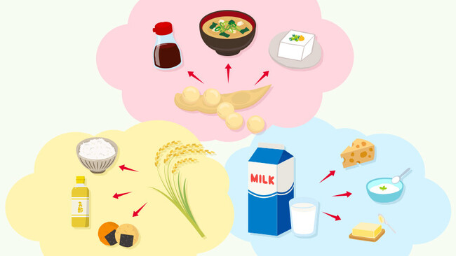 多くの食品の原材料になり、日本人の食生活に欠かせない、変身上手な代表食材は「大豆」です。そのほか、米、牛乳、小麦、卵なども、多くの食品に姿を変えます。
