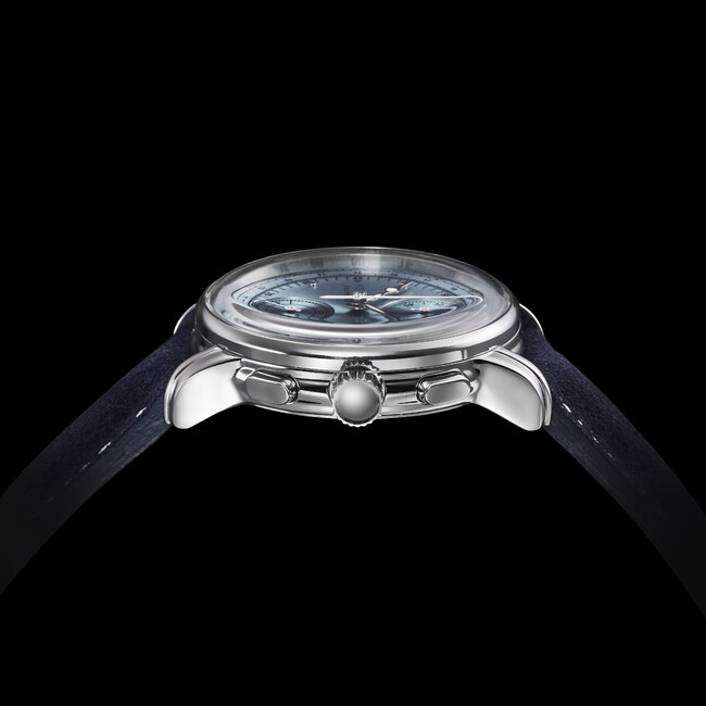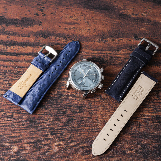 そのフラッグシップシリーズに加わる透き通ったブルーのクロノグラフ。スウェードのカーフレザーに加え、ドイツ発の名門タンナー「ワインハイマー」社製のベルトをセットした、伊勢丹だけのスペシャルエディションです。