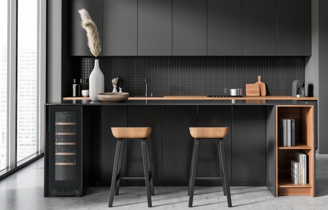 放熱を本体前面から行うことで、必要な放熱スペースを左右5mm、背面5mm、上部5mm(※)に抑えました。通常のワインセラーのように据え置きとしての使用はもちろん、カウンター下へビルトインとして設置することも可能です。
